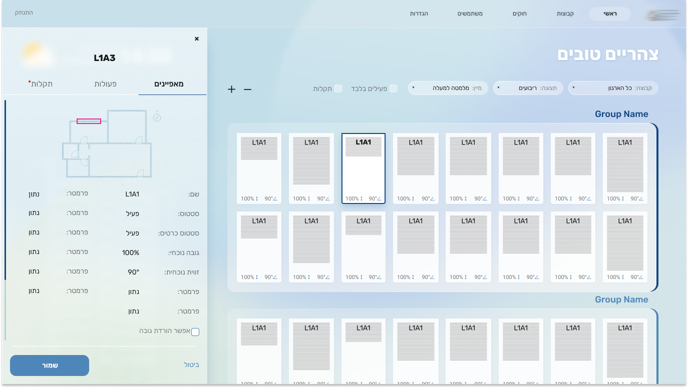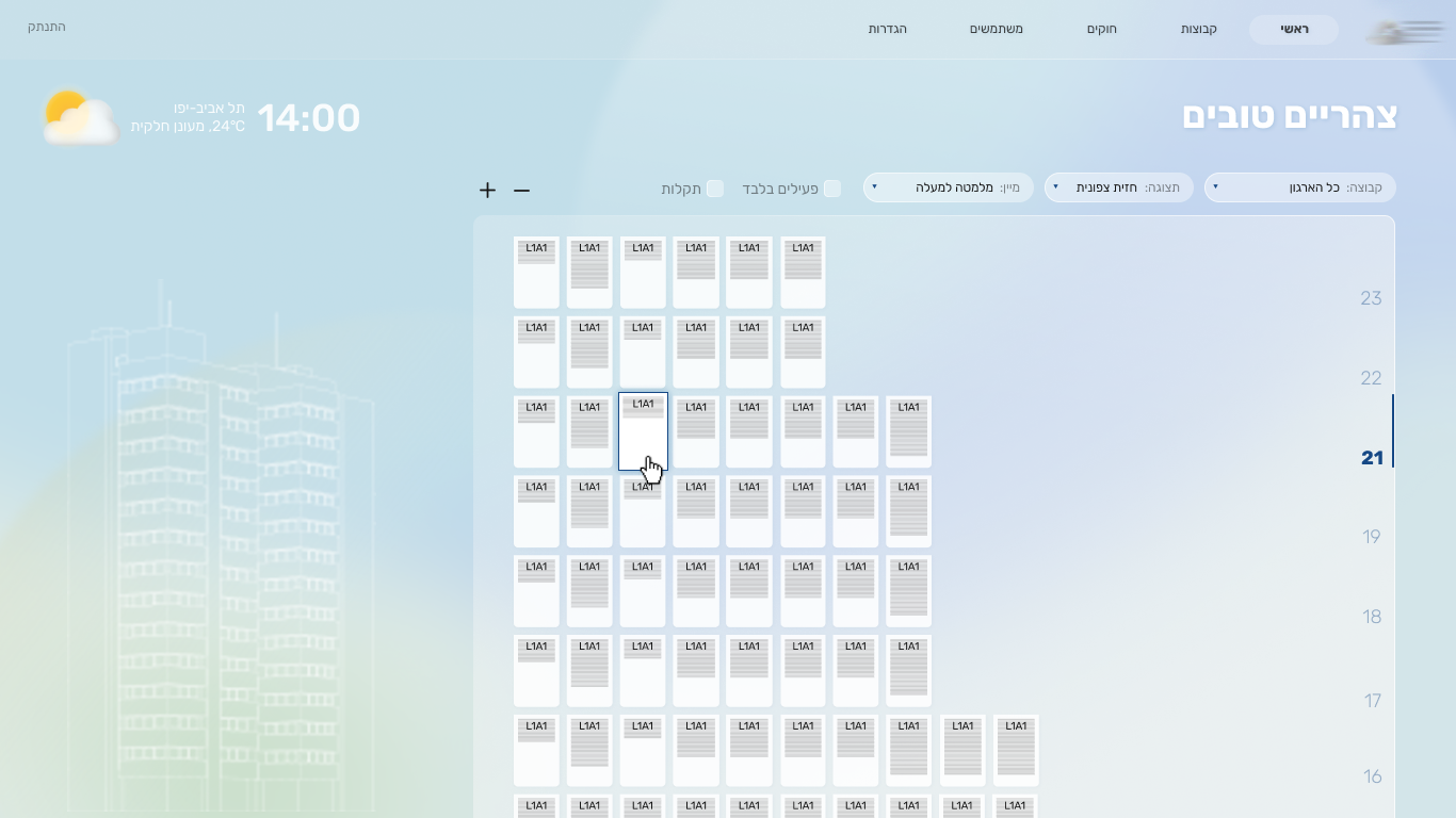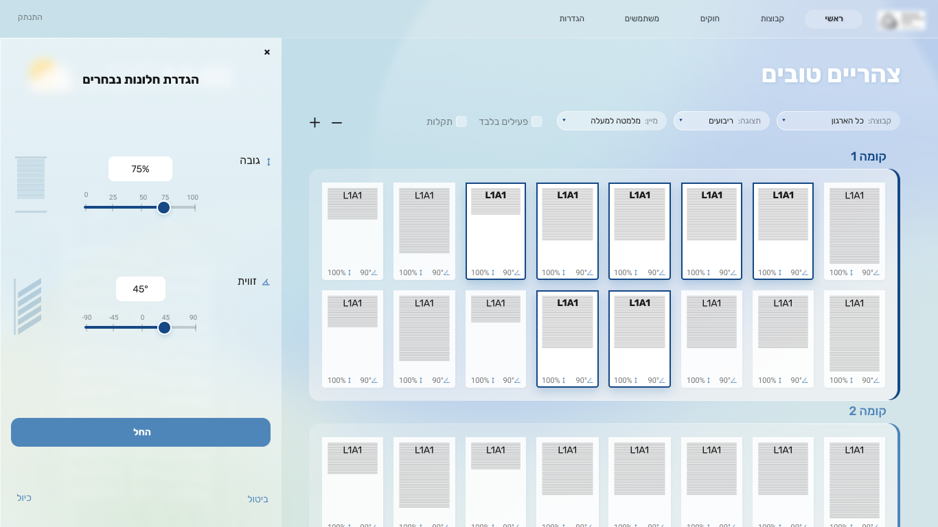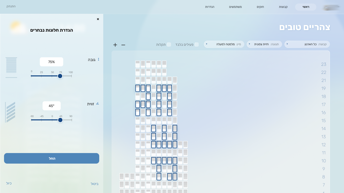 The interface was designed around different levels of control and zoom, allowing users to move seamlessly between building views, façades, floors, and specific windows. Time of day and weather conditions were integrated into the design, as they directly influence shading needs
